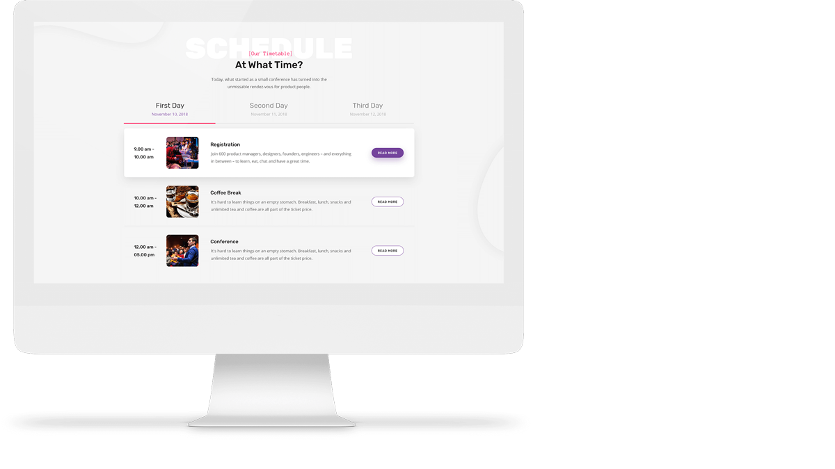 GenesisExpo includes different variants of timetable. Whether you would like to show a general overview and timetables of the events, or you are looking to make an in-depth event content showcase, choose which one.